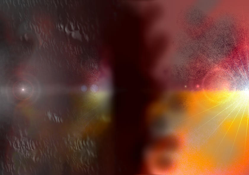14. Station Das Licht des Retters wird durch einen Stein verdeckt auf dem auch rote Farbe zu erkennen ist. Voller Leid legen die Menschen Jesu in sein Grab. Doch dass noch Hoffnung besteht zeigt wieder das gelbe Licht unten links und auch die Strahlen, die hinter dem Stein hervorkommen. Nur die eigentliche Lichtquelle, Jesus, ist noch verborgen.
