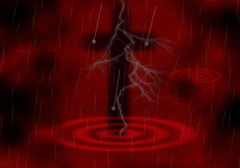 11. Station Die Hauptfarben des Bildes sind Rot und Schwarz, denn durch das Kreuzigen von Jesus verbindet man sehr viel Leid und Tod. Der Regen der hier fällt, bildet im Endeffet auch durch drei Tropfen die Nägel, die geschlagen werden und in einem grau-rotem Punkt am schwarzen Kreuz enden. Somit stehen auch sie für den Schmerz. Außerdem erkennt man auch hier wieder den Blitz, der auch schon beim Bild des Aufladens des Kreuzes vorkommt. Dieses Ereignis ist auch eines der einschneidenden des Kreuzweges Jesu. Mit dem Blitz und dem Kreuz breitet sich auch Wellen des Leides aus, die Zeichen sind für mehr Leid, dargestellt durch die anderen roten Wellen, welches auf der ganzen Welt dadurch entstand.