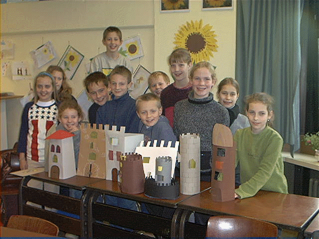 Schülerinnen und Schüler der Klasse 5 b der Bischöflichen Maria-Montessori-Gesamtschule in Krefeld (Schuljahr 2001/2002) mit ihren selbst gebastelten Barbaratürmen.