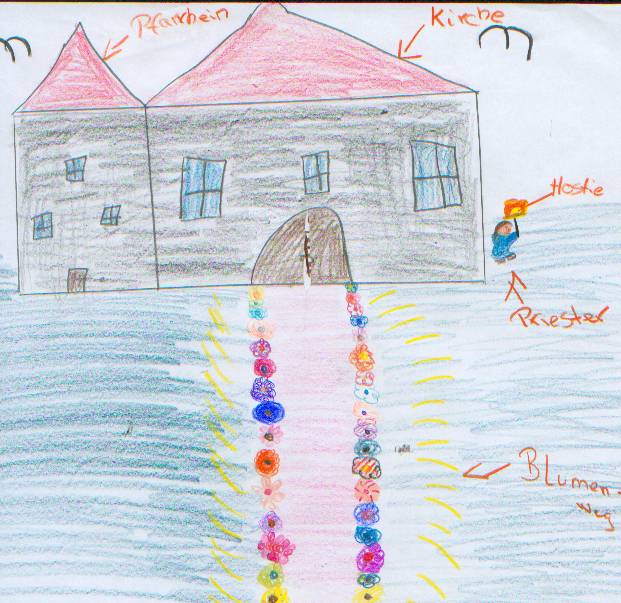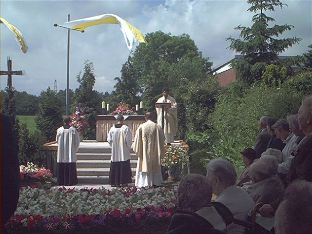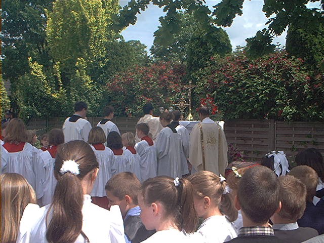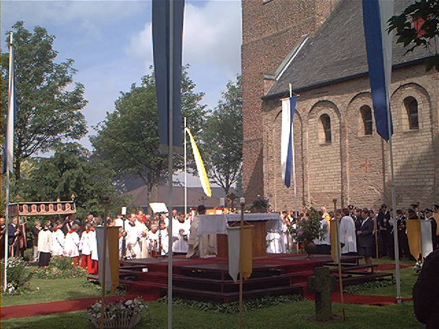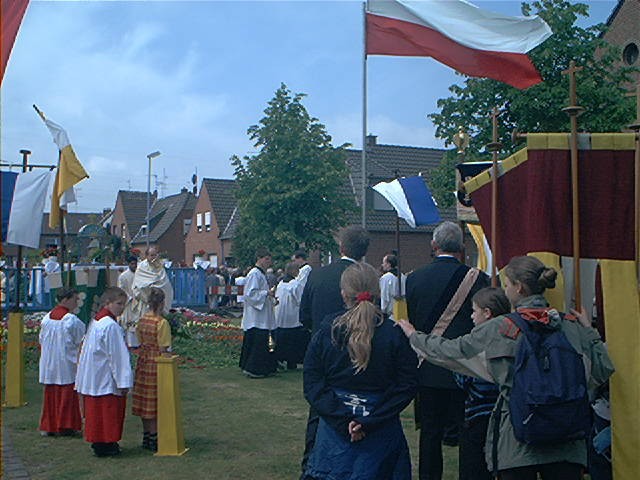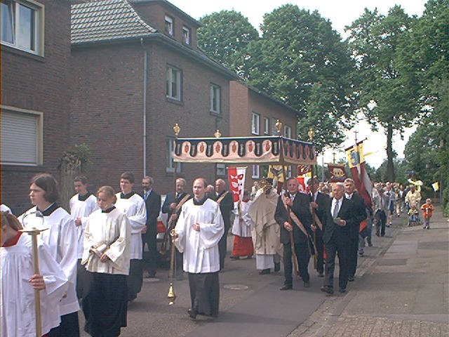 Während der Prozession und vor allem an den Altären erbitten die Gläubigen Segen für Mensch, Vieh und Felder. Um ein äußeres Zeichen in Händen halten zu können, gab es früher den Brauch, an den Altären Kräuter zu empfangen und diese dann gesegnet mit nach Hause zu nehmen. Wovon der Glaube lebt Christentum ist Gemeinschaft. Darum lebt unser Glaube von der Begegnung. Wenn wir Eucharistiefeiern, Gottfeiern, dann feiern wir auch das Leben, unser Leben. Die Gemeinschaft zelebriert die Eucharistie, und die Eucharistie zelebriert die Gemeinschaft, die Eucharistie zelebriert das Leben. Das Band zwischen Gott und dem Leben ist die Gemeinschaft. aus: ZIELONKA; M.: Deutlicher Leben, Steyler, 1996 Fronleichnamsprozession in der St. Willibrord-Gemeinde Kellen, Kreis Kleve, am 30. Mai 2002: 1. Altar an der Alten Kirche: