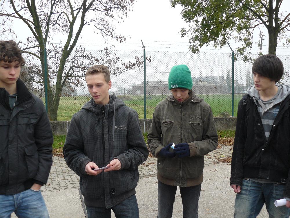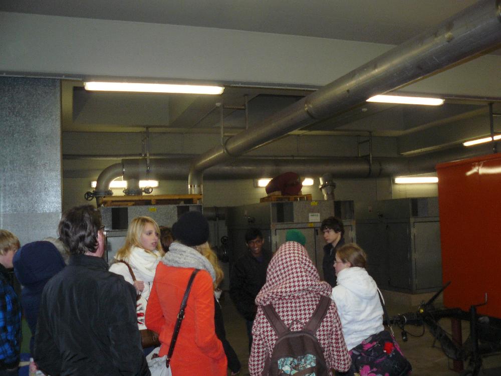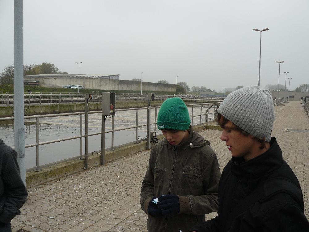 Die Führung durch das Klärwerk kann starten (rechts: drei von den vier Schülern, die die Führung übernommen haben; links: ein interessierter Zuhörer). Wir befinden uns am Einlaufbauwerk (leider auf dem Bild nicht zu sehen). Der Einlaufbereich besteht aus zwei Röhren, durch die das Wasser im Klärwerk ankommt. Insgesamt kommt in Salmorth das Wasser von 46 Pumpstationen an. Da an das Klärwerk 165.000 Einwohner angeschlossen sind, kommt sehr viel Schmutzwasser an ( ca. 16.000 m3 am Tag ) . In Kleve haben wir ein Trennsystem, d.h. es wird versucht, dass nur Schmutzwasser und kein Regenwasser dem Klärwerk zugeführt wird. Das Regenwasser wird direkt dem Gewässer zugeführt.