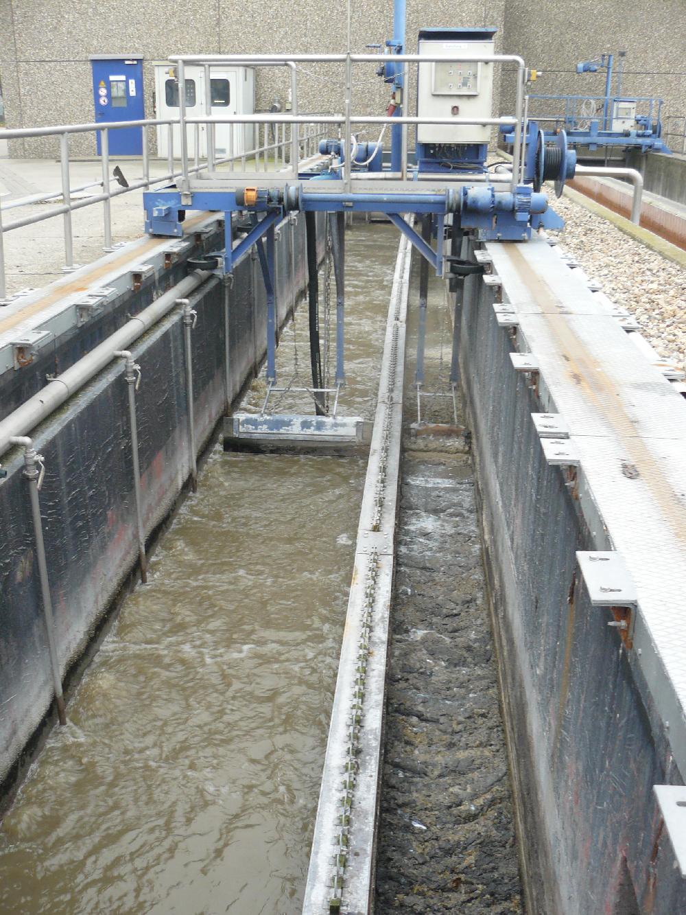 Das Wasser wird mechanisch gereinigt. Dies geschieht durch Rechenanlagen, die den groben Schmutz aus dem Wasser „fischen“. Es gibt zwei Arten an Rechen (Grob- und Feinrechen), die aus senkrecht angeordneten Stäben bestehen; Grobrechen 30 mm und Feinrechen 15 mm. Das Rechengut wird in einer Waschpresse gereinigt, gepresst, in Containern gesammelt und schließlich zur Verbrennung gebracht. In die Maschine, die man auf dem Bild sehen kann, wird ein Sandwassergemisch aus dem Sandfang (siehe unten) eingeführt. Das Wasser wird von Sand getrennt und dem Zulauf (siehe oben) wieder zugeführt. Der Sand wird gesammelt und dann z.B. beim Straßenbau verwertet.