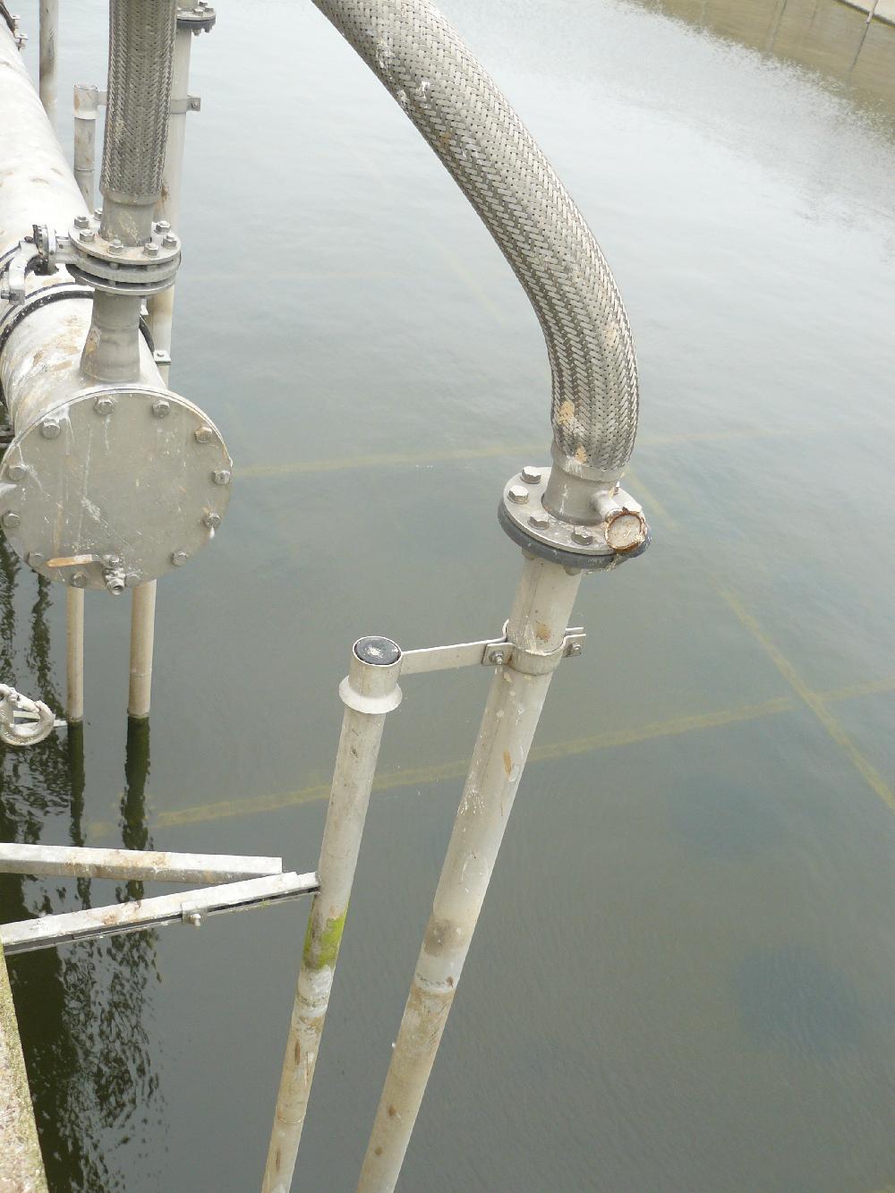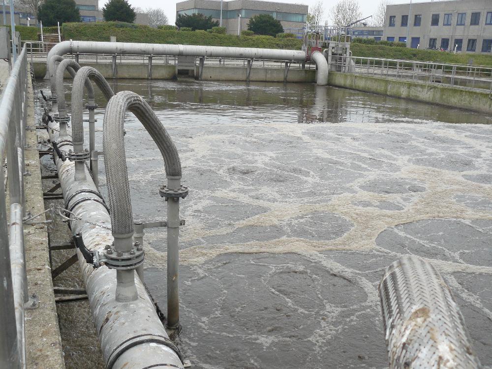 Hier sieht man noch einmal ein Becken der Belebtschlammstraße. Man kann deutlich die verschiedenen Wasseroberflächen und die Schläuche der Sauerstoffversorgung sehen.
