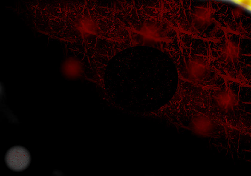 13. Station Wenn man genau schaut, erkennt man oben rechts einen Teil des vorigen Bildes. Man sieht auch die Zeichen in Form von den kleinen Punkten aus dieser Richtung kommen. Doch von diesem Ereignis bekommen die Menschen zurzeit auf der Erde nichts mit. Sie nehmen mit viel Verbundenheit von Trauer und Leid, auch hier dargestellt durch Rot und Schwarz Jesus vom Kreuz. Dieser ist hier der große schwarze Kreis. Jesus ist tot und die Menschen fühlen sich allein. Das zeigt der kleine graue Punkt unten links, der auch rote Farbe enthält. Er steht leidend völlig allein im Dunkeln und weis nicht mehr weiter. Die Zeichen von Jesus Tod haben ihn noch nicht erreicht.