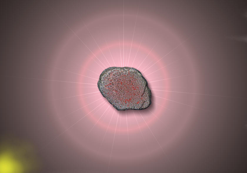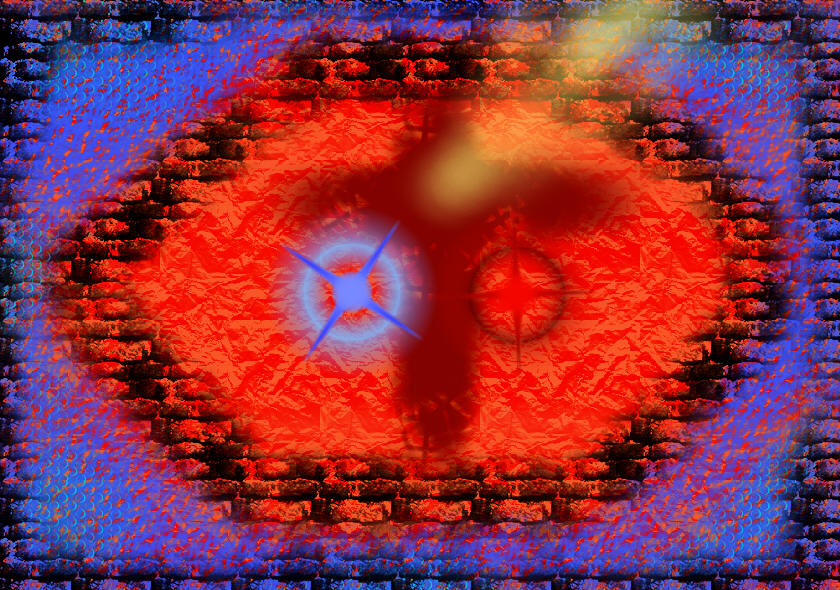 14. Station Das Licht des Retters wird durch einen Stein verdeckt auf dem auch rote Farbe zu erkennen ist. Voller Leid legen die Menschen Jesu in sein Grab. Doch dass noch Hoffnung besteht zeigt wieder das gelbe Licht unten links und auch die Strahlen, die hinter dem Stein hervorkommen. Nur die eigentliche Lichtquelle, Jesus, ist noch verborgen.