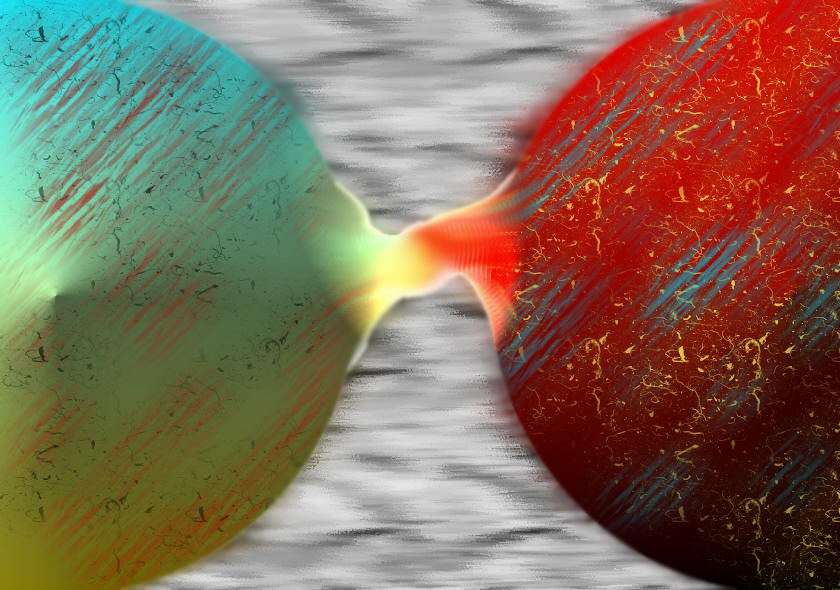 4. Station Auf diesem Bild erkennt man deutlich zwei Kreise, die Jesus (rechts) und seine Mutter (links) darstellen. Die Farben beim rechten Kreis sind Rot und Schwarz, Leid und Tod. Die Farben beim linken Kreis sind helle, freundliche Farben. Doch wenn man genau hinschaut, sieht man, dass in beiden Kreisen jeweils die Farben des anderen Kreises vorkommen. Das und die Verbindung zwischen den Kreisen in der Mitte des Bildes stellt die Verbundenheit der Seelen dar, die beim Treffen von Jesus und seiner Mutter entstanden ist. Der Hintergrund stellt die anderen Personen dar. Da er aber sehr verwischt ist und sich durch eine deutliche weiße Abgrenzung von der Verbundenheit trennt, ist dieser nebensächlich. Die anderen Personen spielten bei dem Ereignis keine Rolle, sei wurden von Jesus nicht wahrgenommen.