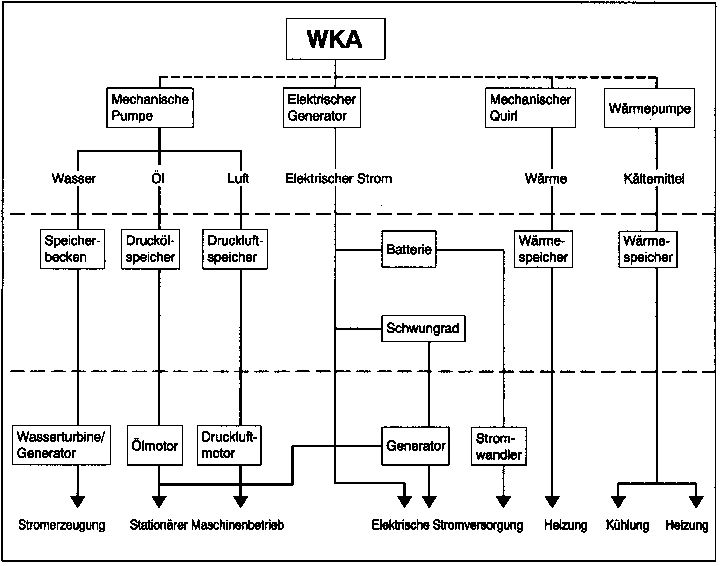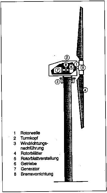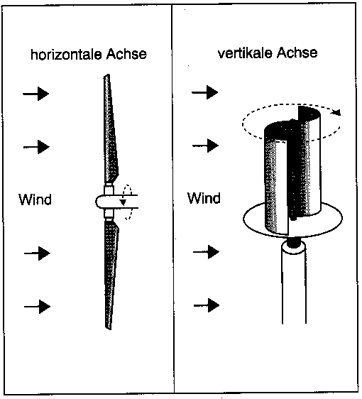 Windenergie Es gibt Vermutungen, dass die Anfänge der Windenergie bis in das zweite Jahrhundert v. Chr. zurückreichen. Damals verwendete man die erzeugte Energie für das Antreiben von Schöpfrädern, für die Be- und Entwässerung von Feldern. Im persischen Raum sind sie ältesten zuverlässig nachgewiesenen Windmühlen zu finden, die dort hauptsächlich für Getreidemühlen Energie produzieren. In Europa sind seit dem 12. Jh. Windmühlen nachweisbar. Heutzutage ist die Erzeugung und die Verwendung von Energie durch Wind schon weit verbreitet und fortgeschritten, trotzdem stellt sich die Frage, wie dieser Vorgang vonstatten geht. Natürlich kann ohne den Hauptfaktor, von dem letztendlich alles abhängt nichts funktionieren, dem Wind! Die Entstehung von Wind, genauer gesagt von Luftströmen hängt hauptsächlich von der Sonne ab. Die Sonne erwärmt die Erdoberfläche, wobei erwärmte Luft nach oben steigt. Nun erwärmt sich die Luft über dem Kontinent schneller als über dem Wasser, was zur Folge hat, dass die Luft über dem Kontinent schneller nach oben steigt, als die über dem Wasser, so dass der Luft Freiraum der so geschaffen wird von der noch kühleren Meeresluft in Anspruch genommen wird. Dadurch entsteht Wind. Doch dieser Vorgang kann auch andersherum vonstatten gehen. Dazu muß die Luft über dem Wasser wärmer sein als über dem Kontinent, welches in der Nacht der Fall ist. Da die Luft über dem Kontinent schneller abkühlt als über dem Wasser dreht sich das Verfahren, welches tagsüber abläuft, um. Da die Erde von der Sonne durch die Erdkrümmung unterschiedlich erwärmt wird, entstehen Druckzustände, die durch den Wind ausgeglichen werden. Dabei strömt die Luft grundsätzlich aus dem Hochdruckgebiet in das Tiefdruckgebiet. Doch auch andere Faktoren, wie die Beschaffenheit der Landesoberfläche und auch Gebäude, beeinträchtigen den Strömungsverlauf. Wind strömt nie gleichmäßig, auch wenn die Stetigkeit der Strömung mit der Höhe zunimmt. Deutschland ist in drei Windzonen eingeteilt, womit die Brauchbarkeit von Windkraftanlagen in verschiedenen Gebieten gegliedert ist. Zone 1 ist günstig für den Betrieb von größeren Windkraftanlagen, da in einer Höhe von 10 und 150 Metern eine Windgeschwindigkeit mit mehr als 5 m/s herrscht. Dieser Wert entspricht der Windstärke 4. Zone 1 befindet sich an der Nord - und Ostseeküste, aber auch in der westlichen Eifel, der Rhön und im Hochschwarzwald. Zone 2 ist für die Nutzung von Windkraftanlagen nur bedingt geeignet, da die Windgeschwindigkeiten in 10 Metern Höhe zwischen 1 und 5 m/s liegt. Dieser Wert entspricht ungefähr der Windstärke 3. Die Zone 2 befindet sich im Bereich der Norddeutschen Tiefebene. Aber auch Schleswig - Holstein und Mecklenburg - Vorpommern, das Mittelgebirge, der Schwarzwald und die Schwäbische Alb befinden sich in 2. Zone. Die dritte Zone ist für den Betrieb von größeren Windkraftanlagen ungünstig, weil in einer Höhe von 10 und 150 Metern die jährliche Anzahl der Flautestunden bei über 20% liegt. Das sind mehr als 1752 Stunden pro Jahr. In 10 Metern Höhe beträgt die Windgeschwindigkeit im Durchschnitt weniger als 3,3 m/s; was Windstärke 2 bedeutet. Für die Erzeugung von Windenergie ist aber nicht nur der Wind wichtig, sondern natürlich auch die Windkraftanlage selber. Dabei spielt das Windrad die wichtigste Rolle, weil es der Energieumwandler ist. Dies bedeutet, dass aus strömender Luft ein Teil der enthaltenen kinetischen Energie (Bewegungsenergie) von dem Energieumwandler entnommen und in Rotationsenergie umgewandelt wird. Mit dieser Energie lassen sich unterschiedliche Maschinen betreiben. Es gibt zwei verschiedene Bauformen von Windrädern. Zum Einen gibt es Windräder mit waagerecht angeordneter Welle ( horizontale Achse) und zum anderen gibt es Windräder mit senkrechter Welle ( vertikale Achse ). die zwei Bauformen von Windrädern Heutzutage werden für die Erzeugung von Strom Windräder mit horizontaler Achse verwendet. Diese besitzen drei Rotorblätter ( Windradblätter) und ermöglichen eine optimale Produktion. Nun besteht aber eine Windkraftanlage, die zur Stromerzeugung dient aus drei wesentlichen Bausteinen, dem Windrotor, dem Getriebe und dem Generator, doch auch eine Turmkonstruktion und eine Steuerung der Anlage die aber auch zur Aufnahme und Speicherung der erzeugten elektrischen Energie dient. Die Leistung, die eine Windkraftanlage erbringt, hängt zuerst von der Windgeschwindigkeit ab, die am Standort herrscht, d.h. also auch dass die Turmhöhe die Leistung bestimmt, da die Windgeschwindigkeit mit der Höhe zunimmt. Des weiteren bestimmen Flügelkreisfläche ( eine Verdoppelung der Flügelkreisfläche bedeutet gleichzeitig eine Verdoppelung der Leistung) und die Generatorgröße ( die installierte Generatorleistung muss auf das Gesamtkonzept abgestimmt sein) die Leistung. Schema eines Horizontalachskonverters Die erzeugte Energie einer Windkraftanlage lässt sich zum Antrieb von mechanischen Wasser-, Öl- oder Luftpumpen, Elektrogeneratoren, mechanischen Wärmequirlen und mechanischen Wärmepumpen nutzen. Es ist aber auch möglich die elektrische Energie zu speichern, wobei auf der einen Seite Verluste entstehen, aber auf der anderen Seite diese in Kauf genommen werden können, da eine ständige Übereinstimmung zwischen Energieangebot und Energiebedarf nicht vorhanden ist. Es gibt nun verschiedene Möglichkeiten vorhandene Energie zu speichern. Zunächst lässt sich Energie über ein Medium in Form potentieller Energie speichern, z.B. als Wasserreservoir in einem Wasserturm oder als Druckluft im Kompressorbehälter. Es kann aber auch der vom Generator erzeugte Strom als elektrische Energie in eine Batterie ( Akku ) gesammelt werden. Die dritte Möglichkeit ist die Umwandlung der Rotationsenergie in Wärmeenergie. Dazu ist ein mechanischer Quirl nötig, der durch Widerstandsreibung Wasser erhitzt, so dass er als Wärmespeicher dient. Als letzte Möglichkeit tre