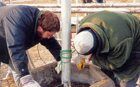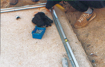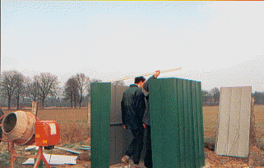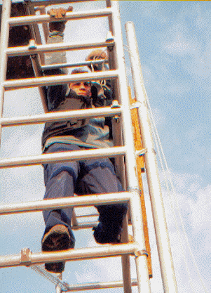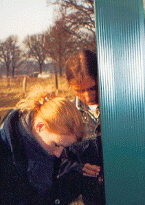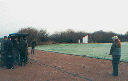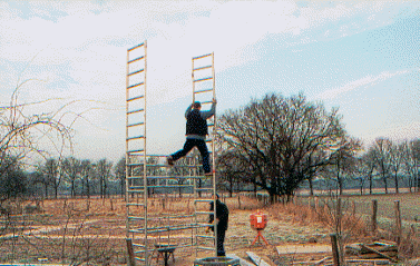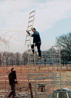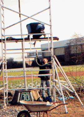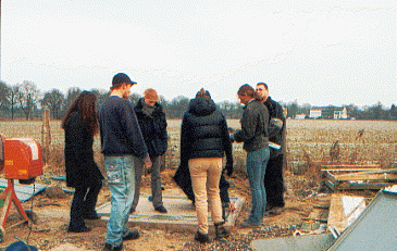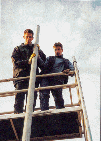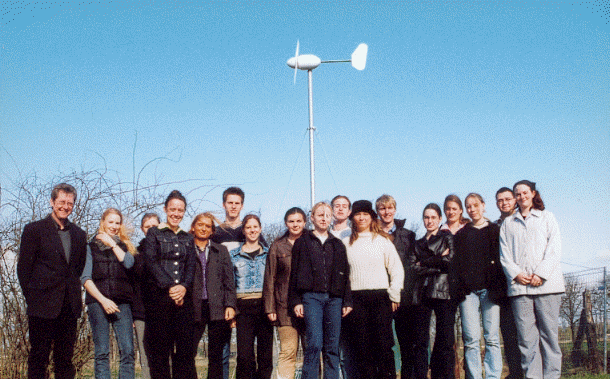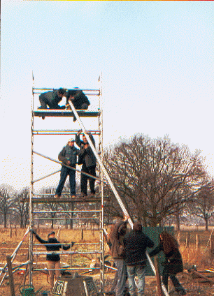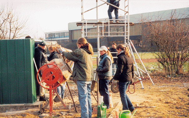 Am 17. Januar 2001 wurde das nun schon seit längerem geplante Projekt Windkraftanlage praktisch in Angriff genommen. Fast der ganze Kurs war bereit, an diesem eigentlich unterrichtsfreien Tag mit anzupacken. Bevor wir mit dem Aufbau der Windkraftanlage begannen, teilten wir die verschiedenen Arbeiten untereinander auf. Herr Tyssen hatte eine Woche zuvor aus Kleve mit Hilfe eines Anhängers das sechs Meter lange Mastrohr mitgebracht. Die in Kleve ansässige Schlosserei Herbert Korgel (http://www.mon.de/nr/korgel) hatte uns dankenswerterweise das Gestänge zum Selbstkostenpreis hergestellt. Die erste Gruppe befasste sich mit dem Aufbau eines Schuppens, in dem die Ladestation untergebracht wird. Die nächste Gruppe machte sich den Aufbau des Gerüstes zur Errichtung des galvanisierten Mastrohres zueigen, während eine dritte Gruppe beim Aufbau des Pfahles half und die Windkraftanlage mit Hilfe von Stahlseilen und Pflöcken absicherte. Um 10 Uhr trafen wir uns dann in unserem Schulgarten. Dort begann die eine Gruppe nun direkt mit dem Aufbau des Gerüsts, während die zweite Gruppe sofort mit dem Aufbau des Schuppens begann. Dies geschah auf einer bereits betonierten Fläche, die Schüler des Jahrganges 9 an ihrem Projekttag angelegt hatten. Sobald das Gerüst fest auf dem Boden stand, begann die dritte Gruppe Wasser aus dem „Trog" herauszuholen. Bedingt durch die lange Standzeit hatte sich dieses dort angesammelt. Mit Rat und Tat unterstützte uns Herr Grubert, für den dies schon die vierte selbsterrichtete Windkraftanlage ist. Dann ging es an die Errichtung des Mastrohres. Zur Stabilisierung wurden Abspannseile gefertigt und am Rohr angebracht. Währenddessen war der Bau des Schuppens in vollem Gange, auch wenn man am Anfang ein paar Schwierigkeiten mit dem Ausbalancieren hatte. Nachdem aber auch diese Probleme mit ein paar Stückchen Holz erledigt waren, steht der Schuppen heute fest und vor allem gerade auf dem richtigen Fleck. Anschließend wurde der Betonsockel mit viel Beton aufgefüllt.